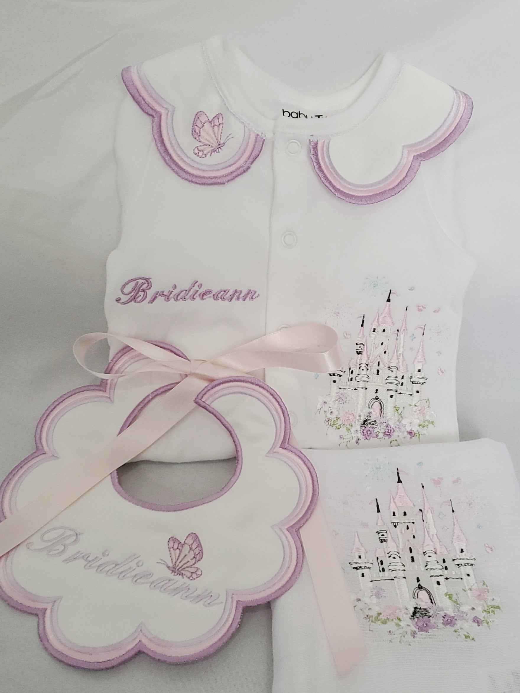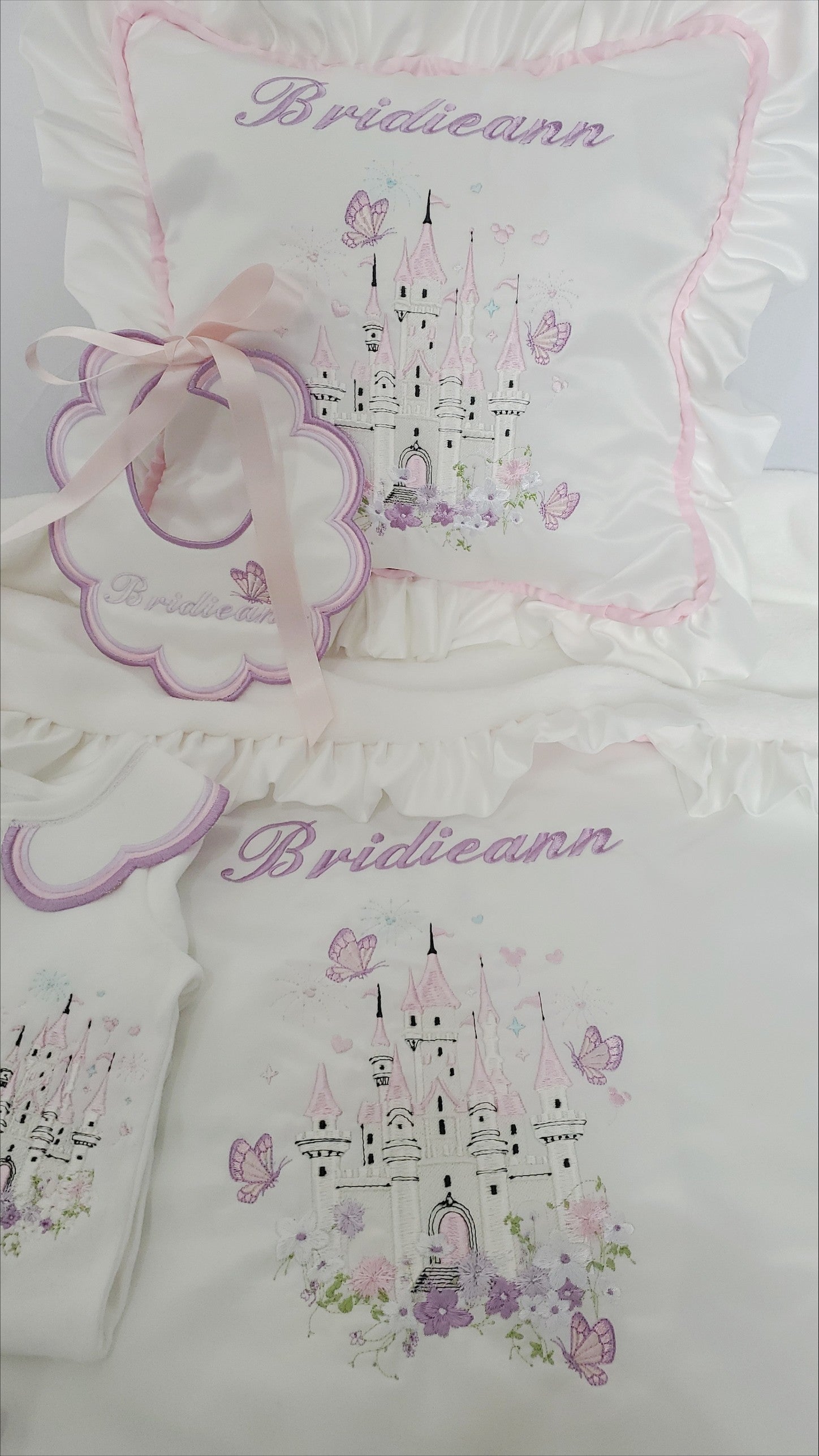 This set includes a Cushion, Satin Crib Blanket, Babygrow, Bib and Muslin